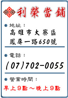 利榮當鋪是經由政府合法立案成立的高雄當舖,秉持著公開、誠信、便捷的經營理念來服務廣大的客戶。 不管個人小額借款、公司週轉、工廠借款、大額融資、汽車借款、房屋二胎、個人借貸、臨時週轉金、、鑽石、珠寶、名錶、時尚精品等萬物皆可借貸。 在您急需資金週轉的關鍵時刻,利榮當鋪提供最佳的借貸流程與還款方式,讓您省去銀行繁瑣的借貸手續,給您合法迅速、便利簡單、安心低息的典當借款流。 只要您有穩定的工作收入, 均和當鋪秉持客戶低利息原則,做最好的服務提供一個全方位資金週轉管道,方便您大額週轉,並有降息代償等優惠專案,一通電話,馬上諮詢!!